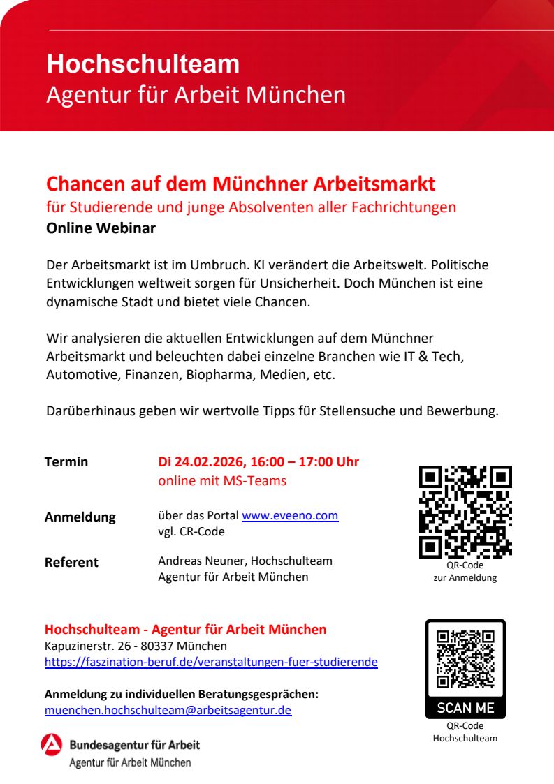 Das Hochschulteam der Agentur für Arbeit München bietet im Februar und März eine Reihe kostenloser Online-Webinare, die genau bei diesen Fragen ansetzen.